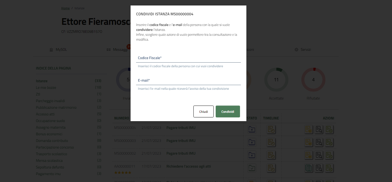 La sezione Istanze mostra in modo analitico ogni singola istanza presentata e il suo stato.