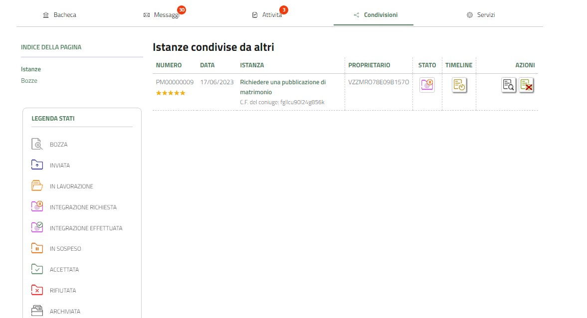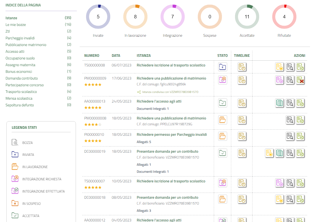Le istanze presentate sono connotate da simboli interpretabili mediante la legenda posta sulla sinistra della pagina, che vi aiutano a capire lo stato in cui verte l'istanza e le azioni che si possono svolgere come la consultazione, la duplicazione e la condivisione