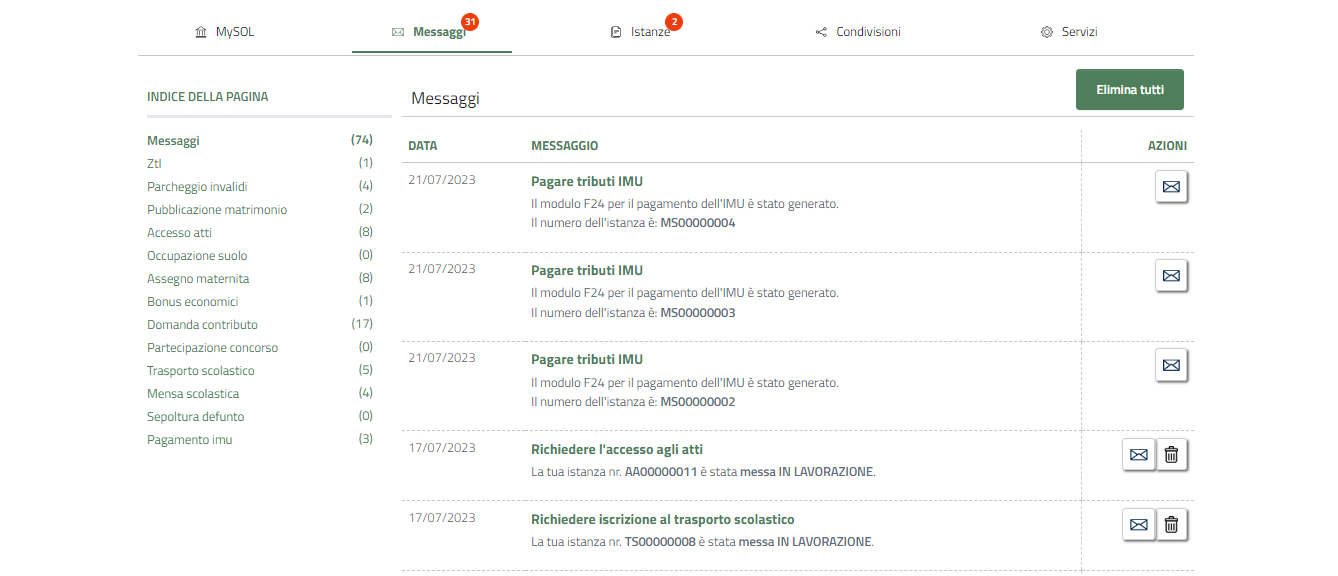 La sezione Messaggi contiene le comunicazioni che notificano lo stato di ogni singola istanza.