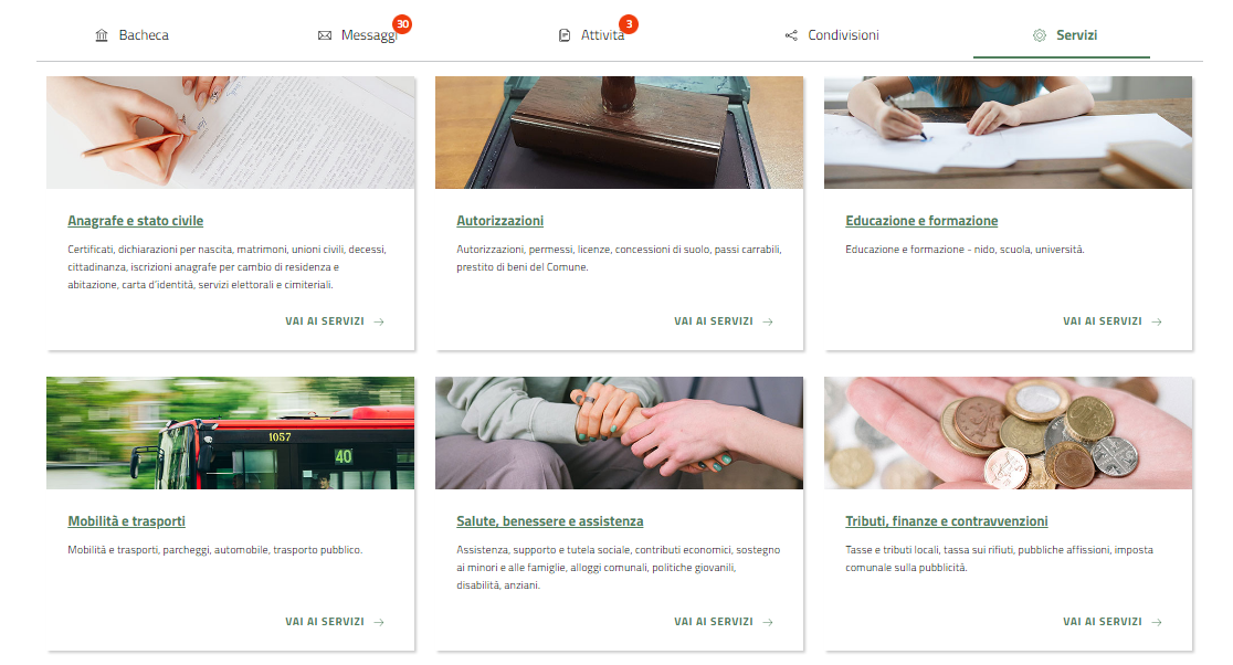 La sezione Servizi è invece un'ulteriore modalità di accesso ai servizi digitalizzati del Comune.