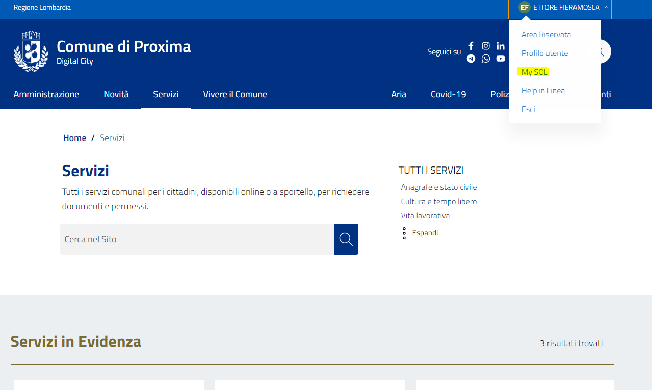 Per avere sempre sotto controllo le istanze presentate è presente un cruscotto personale accessibile, previo login, cliccando sul proprio nome in alto a destra, e selezionando My Sol.