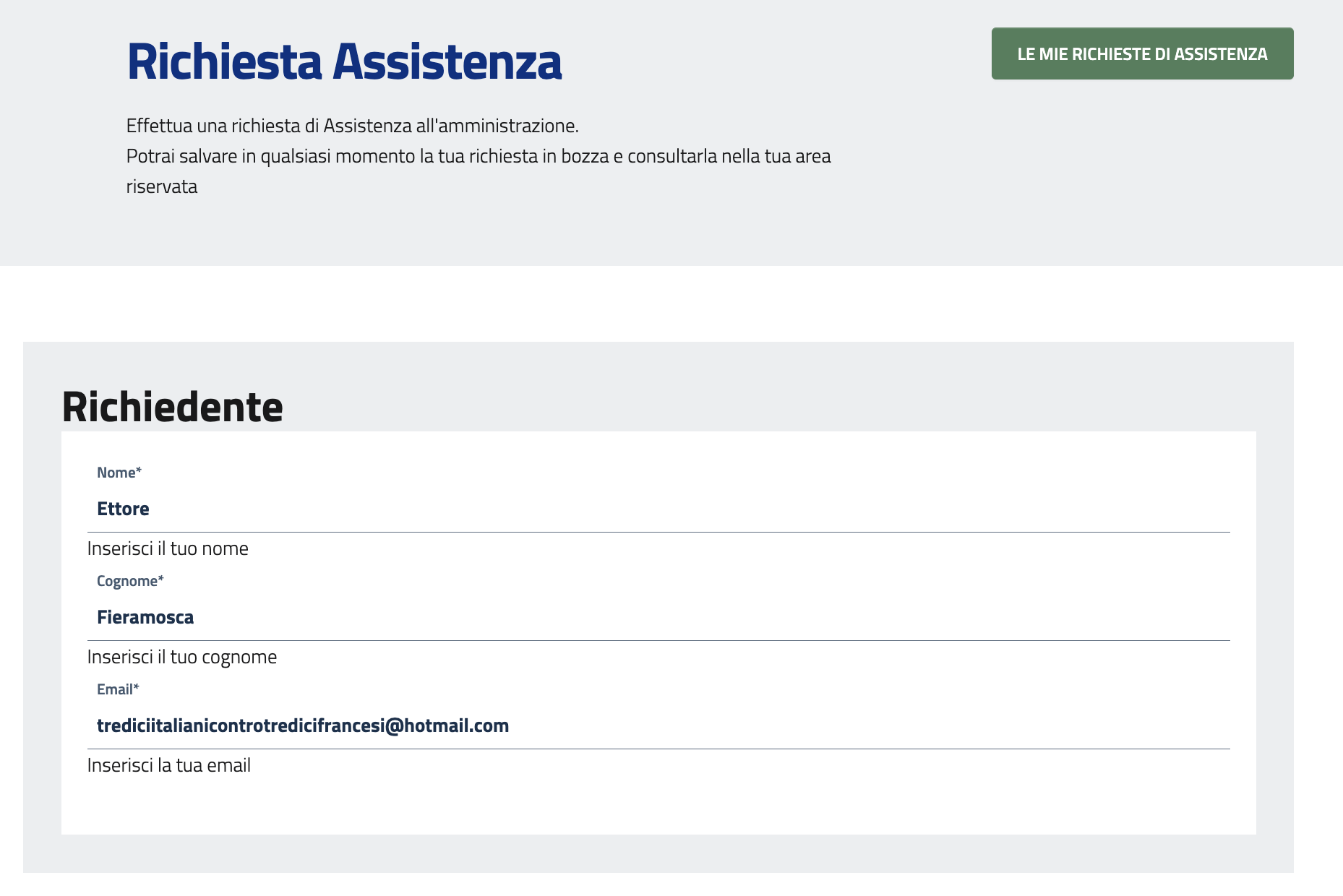 Per effettuare una richiesta di assistenza all'amministrazione riguardo un ufficio o un servizio, si deve cliccare su "Le mie richieste" e poi "Richiedi Assistenza".